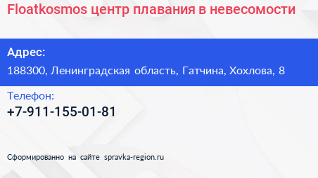 Floatkosmos, центр плавания в невесомости по адресу 188300, Ленинградская область, Гатчина, Хохлова, 8 в дальнейшем Организация, размещена в следующих категориях: