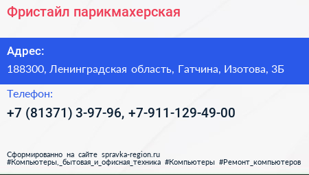 Фристайл, парикмахерская по адресу 188300, Ленинградская область, Гатчина, Изотова, 3Б в дальнейшем Организация, размещена в следующих категориях: