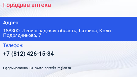Горздрав, аптека по адресу 188300, Ленинградская область, Гатчина, Коли Подрядчикова, 7 в дальнейшем Организация, размещена в следующих категориях: