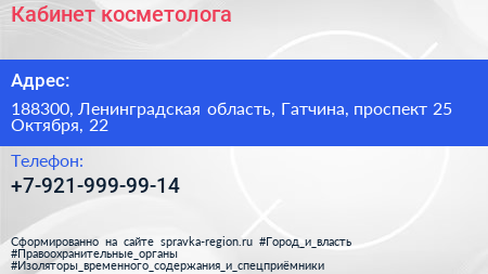 Кабинет косметолога по адресу 188300, Ленинградская область, Гатчина, проспект 25 Октября, 22 в дальнейшем Организация, размещена в следующих категориях: