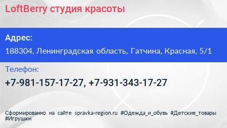 LoftBerry, студия красоты по адресу 188304, Ленинградская область, Гатчина, Красная, 5/1 в дальнейшем Организация, размещена в следующих категориях: