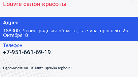 Louvre, салон красоты по адресу 188300, Ленинградская область, Гатчина, проспект 25 Октября, 8 в дальнейшем Организация, размещена в следующих категориях: