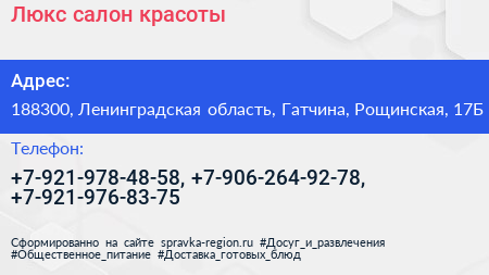 Люкс, салон красоты по адресу 188300, Ленинградская область, Гатчина, Рощинская, 17Б в дальнейшем Организация, размещена в следующих категориях: