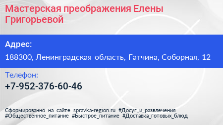 Мастерская преображения Елены Григорьевой по адресу 188300, Ленинградская область, Гатчина, Соборная, 12 в дальнейшем Организация, размещена в следующих категориях: