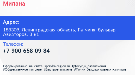 Милана по адресу 188309, Ленинградская область, Гатчина, бульвар Авиаторов, 3 к1 в дальнейшем Организация, размещена в следующих категориях:
