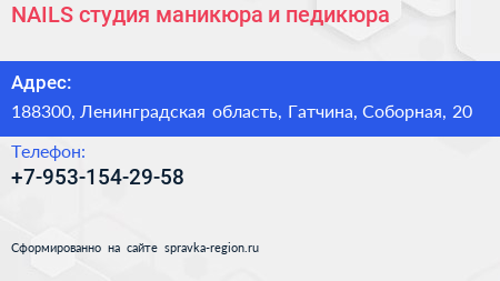 NAILS, студия маникюра и педикюра по адресу 188300, Ленинградская область, Гатчина, Соборная, 20 в дальнейшем Организация, размещена в следующих категориях: