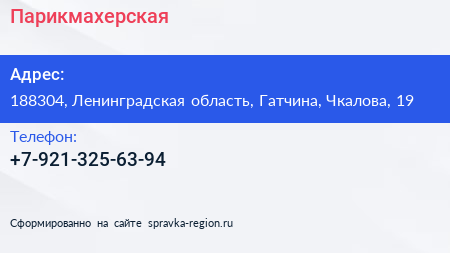 Парикмахерская по адресу 188304, Ленинградская область, Гатчина, Чкалова, 19 в дальнейшем Организация, размещена в следующих категориях: