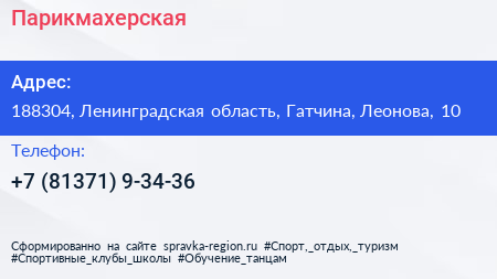 Парикмахерская по адресу 188304, Ленинградская область, Гатчина, Леонова, 10 в дальнейшем Организация, размещена в следующих категориях: