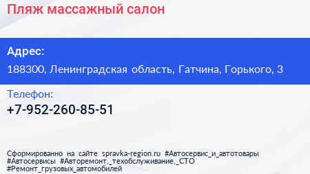 Пляж, массажный салон по адресу 188300, Ленинградская область, Гатчина, Горького, 3 в дальнейшем Организация, размещена в следующих категориях: