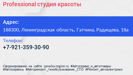 Professional, студия красоты по адресу 188300, Ленинградская область, Гатчина, Радищева, 18а в дальнейшем Организация, размещена в следующих категориях: