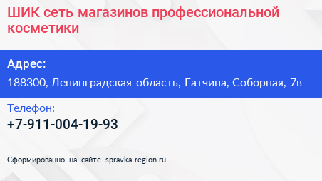ШИК, сеть магазинов профессиональной косметики по адресу 188300, Ленинградская область, Гатчина, Соборная, 7в в дальнейшем Организация, размещена в следующих категориях: