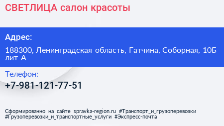 СВЕТЛИЦА, салон красоты по адресу 188300, Ленинградская область, Гатчина, Соборная, 10Б лит А в дальнейшем Организация, размещена в следующих категориях: