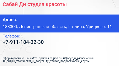 Сабай Ди, студия красоты по адресу 188300, Ленинградская область, Гатчина, Урицкого, 11 в дальнейшем Организация, размещена в следующих категориях: