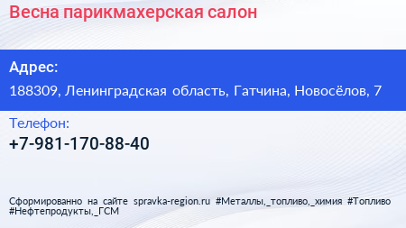 Весна, парикмахерская-салон по адресу 188309, Ленинградская область, Гатчина, Новосёлов, 7 в дальнейшем Организация, размещена в следующих категориях: