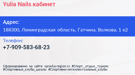 Yulia Nails, кабинет по адресу 188300, Ленинградская область, Гатчина, Волкова, 1 к2 в дальнейшем Организация, размещена в следующих категориях: