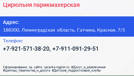 Цирюльня, парикмахерская по адресу 188300, Ленинградская область, Гатчина, Красная, 7/5 в дальнейшем Организация, размещена в следующих категориях: