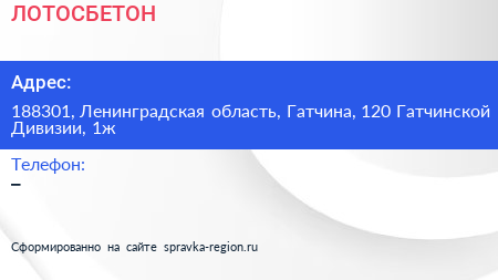 ЛОТОСБЕТОН по адресу 188301, Ленинградская область, Гатчина, 120 Гатчинской Дивизии, 1ж в дальнейшем Организация, размещена в следующих категориях: