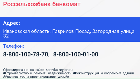 Россельхозбанк, банкомат по адресу Ивановская область, Гаврилов Посад, Загородная улица, 32 в дальнейшем Организация, размещена в следующих категориях:
