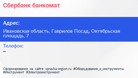 Сбербанк, банкомат по адресу Ивановская область, Гаврилов Посад, Октябрьская площадь, 7 в дальнейшем Организация, размещена в следующих категориях:
