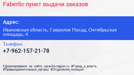 Faberlic, пункт выдачи заказов по адресу Ивановская область, Гаврилов Посад, Октябрьская площадь, 4 в дальнейшем Организация, размещена в следующих категориях: