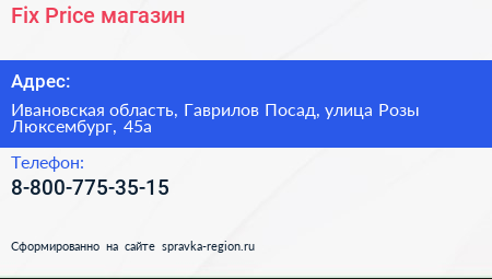 Fix Price, магазин по адресу Ивановская область, Гаврилов Посад, улица Розы Люксембург, 45а в дальнейшем Организация, размещена в следующих категориях: