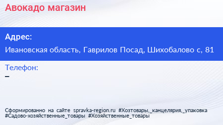 Авокадо, магазин по адресу Ивановская область, Гаврилов Посад, Шихобалово с, 81 в дальнейшем Организация, размещена в следующих категориях: