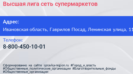 Высшая лига, сеть супермаркетов по адресу Ивановская область, Гаврилов Посад, Ленинская улица, 11 в дальнейшем Организация, размещена в следующих категориях: