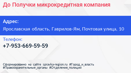 До Получки, микрокредитная компания по адресу Ярославская область, Гаврилов-Ям, Почтовая улица, 10 в дальнейшем Организация, размещена в следующих категориях: