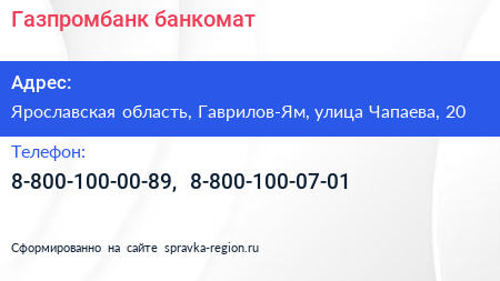 Газпромбанк, банкомат по адресу Ярославская область, Гаврилов-Ям, улица Чапаева, 20 в дальнейшем Организация, размещена в следующих категориях: