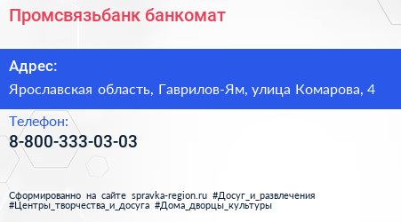 Промсвязьбанк, банкомат по адресу Ярославская область, Гаврилов-Ям, улица Комарова, 4 в дальнейшем Организация, размещена в следующих категориях: