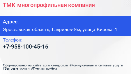 ТМК, многопрофильная компания по адресу Ярославская область, Гаврилов-Ям, улица Кирова, 1 в дальнейшем Организация, размещена в следующих категориях:
