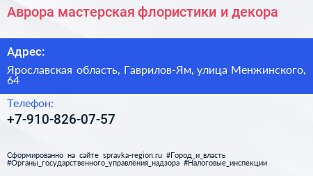 Аврора, мастерская флористики и декора по адресу Ярославская область, Гаврилов-Ям, улица Менжинского, 64 в дальнейшем Организация, размещена в следующих категориях: