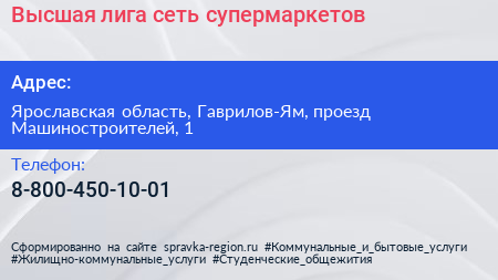 Высшая лига, сеть супермаркетов по адресу Ярославская область, Гаврилов-Ям, проезд Машиностроителей, 1 в дальнейшем Организация, размещена в следующих категориях: