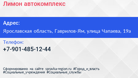 Лимон, автокомплекс по адресу Ярославская область, Гаврилов-Ям, улица Чапаева, 19а в дальнейшем Организация, размещена в следующих категориях:
