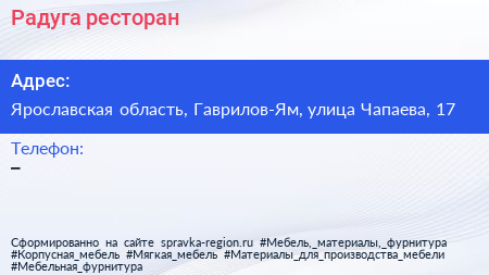Радуга, ресторан по адресу Ярославская область, Гаврилов-Ям, улица Чапаева, 17 в дальнейшем Организация, размещена в следующих категориях: