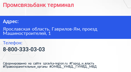 Промсвязьбанк, терминал по адресу Ярославская область, Гаврилов-Ям, проезд Машиностроителей, 1 в дальнейшем Организация, размещена в следующих категориях: