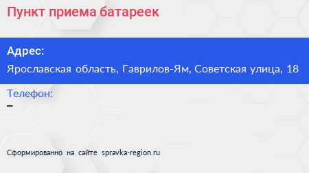 Пункт приема батареек по адресу Ярославская область, Гаврилов-Ям, Советская улица, 18 в дальнейшем Организация, размещена в следующих категориях: