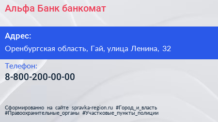Альфа-Банк, банкомат по адресу Оренбургская область, Гай, улица Ленина, 32 в дальнейшем Организация, размещена в следующих категориях: