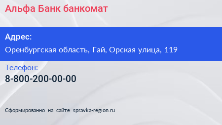 Альфа-Банк, банкомат по адресу Оренбургская область, Гай, Орская улица, 119 в дальнейшем Организация, размещена в следующих категориях: