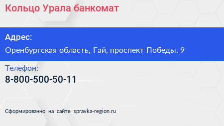 Кольцо Урала, банкомат по адресу Оренбургская область, Гай, проспект Победы, 9 в дальнейшем Организация, размещена в следующих категориях: