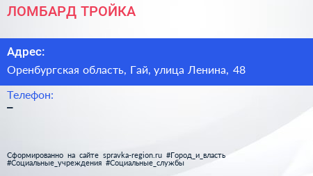 ЛОМБАРД ТРОЙКА по адресу Оренбургская область, Гай, улица Ленина, 48 в дальнейшем Организация, размещена в следующих категориях: