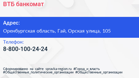 ВТБ, банкомат по адресу Оренбургская область, Гай, Орская улица, 105 в дальнейшем Организация, размещена в следующих категориях: