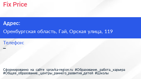 Fix Price по адресу Оренбургская область, Гай, Орская улица, 119 в дальнейшем Организация, размещена в следующих категориях: