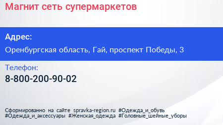 Магнит, сеть супермаркетов по адресу Оренбургская область, Гай, проспект Победы, 3 в дальнейшем Организация, размещена в следующих категориях: