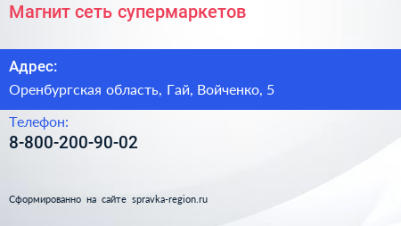 Магнит, сеть супермаркетов по адресу Оренбургская область, Гай, Войченко, 5 в дальнейшем Организация, размещена в следующих категориях: