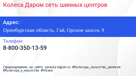Колеса Даром, сеть шинных центров по адресу Оренбургская область, Гай, Орское шоссе, 9 в дальнейшем Организация, размещена в следующих категориях: