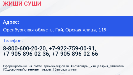 ЖИШИ СУШИ по адресу Оренбургская область, Гай, Орская улица, 119 в дальнейшем Организация, размещена в следующих категориях: