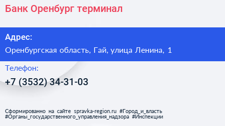 Банк Оренбург, терминал по адресу Оренбургская область, Гай, улица Ленина, 1 в дальнейшем Организация, размещена в следующих категориях: