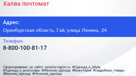 Халва, почтомат по адресу Оренбургская область, Гай, улица Ленина, 24 в дальнейшем Организация, размещена в следующих категориях: