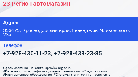 23 Регион, автомагазин по адресу 353475, Краснодарский край, Геленджик, Чайковского, 23а в дальнейшем Организация, размещена в следующих категориях: